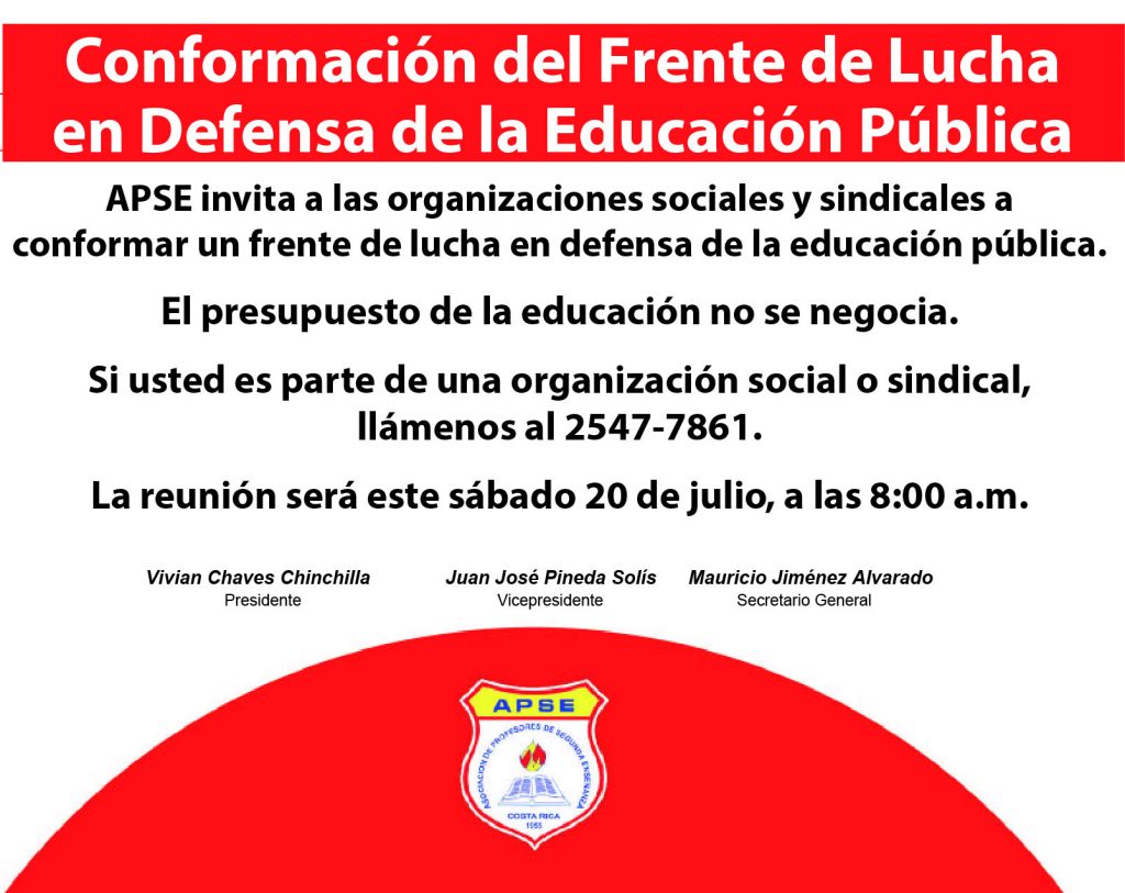 APSE invita a las organizaciones sociales y sindicales a conformar un frente de lucha en defensa de la educación pública.